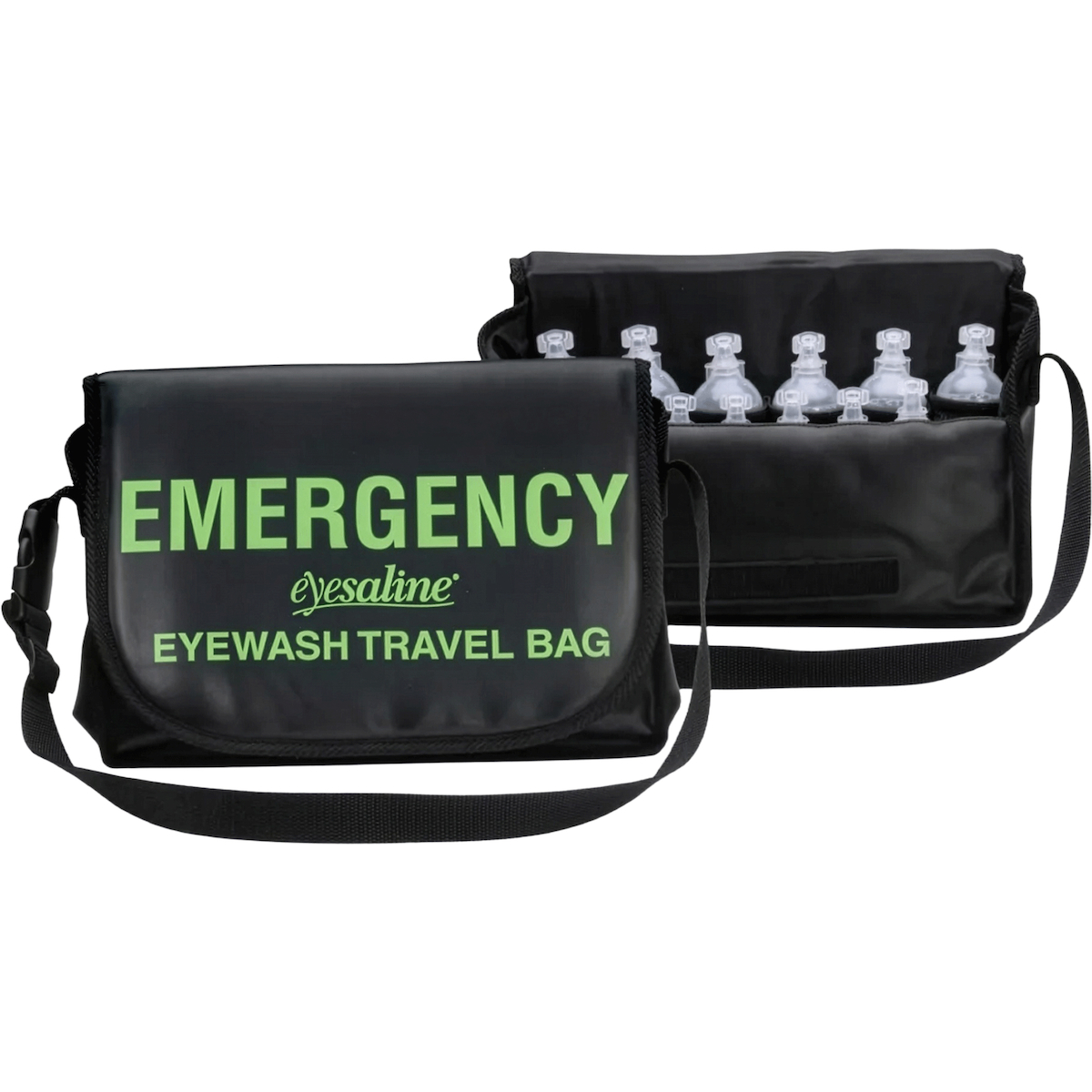 Un sac portatif contient solidement six bouteilles de nettoyage oculaire Eyealine de 1 oz et six bouteilles Eyesaline de 4 oz